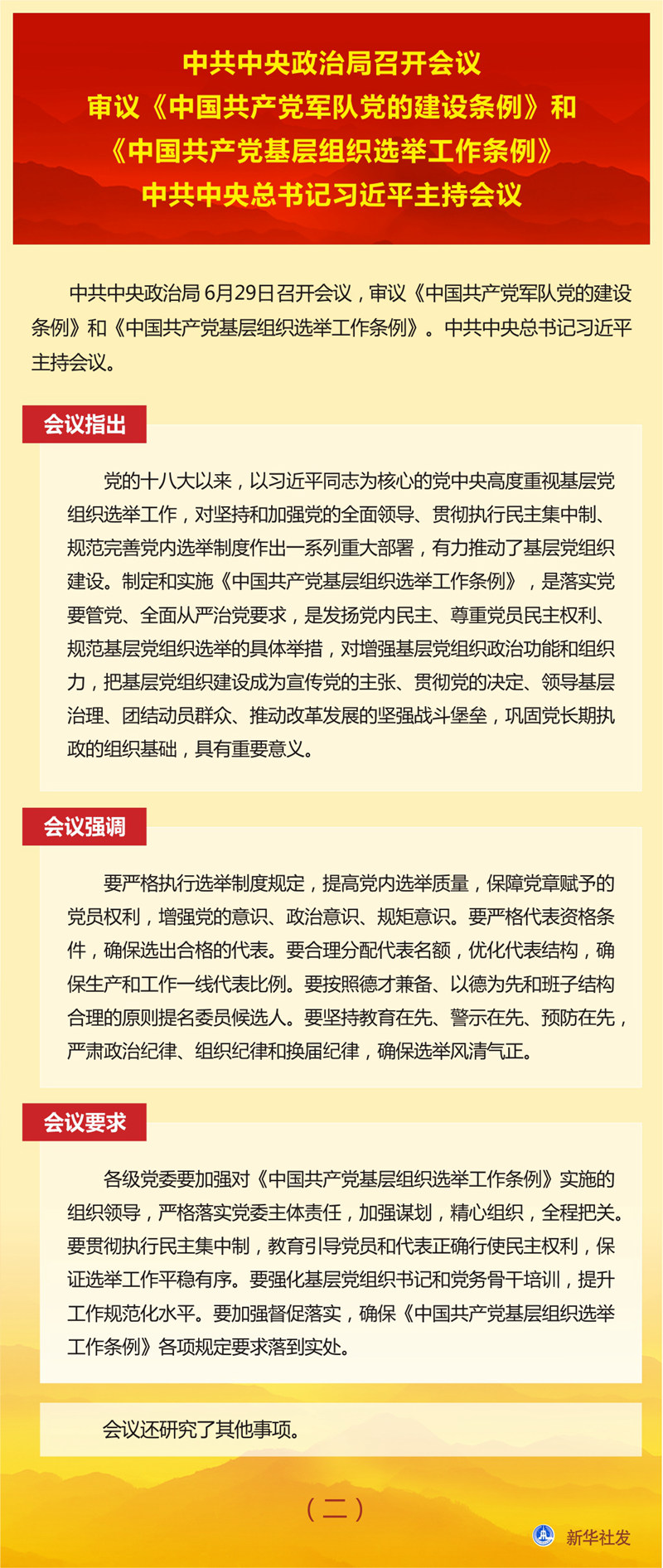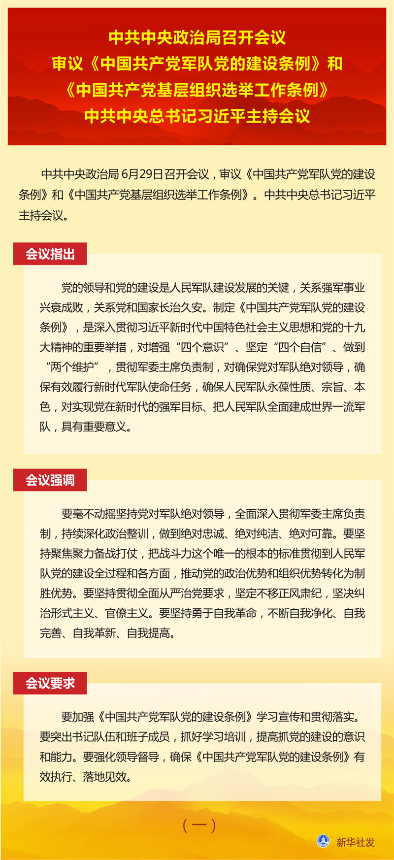 中共中央政治局召開(kāi)會(huì)議 審議《中國(guó)共產(chǎn)黨軍隊(duì)黨的建設(shè)條例》和《中國(guó)共產(chǎn)黨基層組織選舉工作條例》 中共中央總書(shū)記習(xí)近平主持會(huì)議 新華社北京6月29日電 中共中央政治局6月29日召開(kāi)會(huì)議,審議《中國(guó)共產(chǎn)黨軍隊(duì)黨的建設(shè)條例》和《中國(guó)共產(chǎn)黨基層組織選舉工作條例》。中共中央總書(shū)記習(xí)近平主持會(huì)議。 會(huì)議指出,黨的領(lǐng)導(dǎo)和黨的建設(shè)是人民軍隊(duì)建設(shè)發(fā)展的關(guān)鍵,關(guān)系強(qiáng)軍事業(yè)興衰成敗,關(guān)系黨和國(guó)家長(zhǎng)治久安。制定《中國(guó)共產(chǎn)黨軍隊(duì)黨的建設(shè)條例》,是深入貫徹習(xí)近平新時(shí)代中國(guó)特色社會(huì)主義思想和黨的十九大精神的重要舉措,對(duì)增強(qiáng)“四個(gè)意識(shí)”、堅(jiān)定“四個(gè)自信”、做到“兩個(gè)維護(hù)”,貫徹軍委主席負(fù)責(zé)制,對(duì)確保黨對(duì)軍隊(duì)絕對(duì)領(lǐng)導(dǎo),確保有效履行新時(shí)代軍隊(duì)使命任務(wù),確保人民軍隊(duì)永葆性質(zhì)、宗旨、本色,對(duì)實(shí)現(xiàn)黨在新時(shí)代的強(qiáng)軍目標(biāo)、把人民軍隊(duì)全面建成世界一流軍隊(duì),具有重要意義。 會(huì)議強(qiáng)調(diào),要毫不動(dòng)搖堅(jiān)持黨對(duì)軍隊(duì)絕對(duì)領(lǐng)導(dǎo),全面深入貫徹軍委主席負(fù)責(zé)制,持續(xù)深化政治整訓(xùn),做到絕對(duì)忠誠(chéng)、絕對(duì)純潔、絕對(duì)可靠。要堅(jiān)持聚焦聚力備戰(zhàn)打仗,把戰(zhàn)斗力這個(gè)唯一的根本的標(biāo)準(zhǔn)貫徹到人民軍隊(duì)黨的建設(shè)全過(guò)程和各方面,推動(dòng)黨的政治優(yōu)勢(shì)和組織優(yōu)勢(shì)轉(zhuǎn)化為制勝優(yōu)勢(shì)。要堅(jiān)持貫徹全面從嚴(yán)治黨要求,堅(jiān)定不移正風(fēng)肅紀(jì),堅(jiān)決糾治形式主義、官僚主義。要堅(jiān)持勇于自我革命,不斷自我凈化、自我完善、自我革新、自我提高。 會(huì)議要求,要加強(qiáng)《中國(guó)共產(chǎn)黨軍隊(duì)黨的建設(shè)條例》學(xué)習(xí)宣傳和貫徹落實(shí)。要突出書(shū)記隊(duì)伍和班子成員,抓好學(xué)習(xí)培訓(xùn),提高抓黨的建設(shè)的意識(shí)和能力。要強(qiáng)化領(lǐng)導(dǎo)督導(dǎo),確保《中國(guó)共產(chǎn)黨軍隊(duì)黨的建設(shè)條例》有效執(zhí)行、落地見(jiàn)效。 會(huì)議指出,黨的十八大以來(lái),以習(xí)近平同志為核心的黨中央高度重視基層黨組織選舉工作,對(duì)堅(jiān)持和加強(qiáng)黨的全面領(lǐng)導(dǎo)、貫徹執(zhí)行民主集中制、規(guī)范完善黨內(nèi)選舉制度作出一系列重大部署,有力推動(dòng)了基層黨組織建設(shè)。制定和實(shí)施《中國(guó)共產(chǎn)黨基層組織選舉工作條例》,是落實(shí)黨要管黨、全面從嚴(yán)治黨要求,是發(fā)揚(yáng)黨內(nèi)民主、尊重黨員民主權(quán)利、規(guī)范基層黨組織選舉的具體舉措,對(duì)增強(qiáng)基層黨組織政治功能和組織力,把基層黨組織建設(shè)成為宣傳黨的主張、貫徹黨的決定、領(lǐng)導(dǎo)基層治理、團(tuán)結(jié)動(dòng)員群眾、推動(dòng)改革發(fā)展的堅(jiān)強(qiáng)戰(zhàn)斗堡壘,鞏固黨長(zhǎng)期執(zhí)政的組織基礎(chǔ),具有重要意義。 會(huì)議強(qiáng)調(diào),要嚴(yán)格執(zhí)行選舉制度規(guī)定,提高黨內(nèi)選舉質(zhì)量,保障黨章賦予的黨員權(quán)利,增強(qiáng)黨的意識(shí)、政治意識(shí)、規(guī)矩意識(shí)。要嚴(yán)格代表資格條件,確保選出合格的代表。要合理分配代表名額,優(yōu)化代表結(jié)構(gòu),確保生產(chǎn)和工作一線代表比例。要按照德才兼?zhèn)洹⒁缘聻橄群桶嘧咏Y(jié)構(gòu)合理的原則提名委員候選人。要堅(jiān)持教育在先、警示在先、預(yù)防在先,嚴(yán)肅政治紀(jì)律、組織紀(jì)律和換屆紀(jì)律,確保選舉風(fēng)清氣正。 會(huì)議要求,各級(jí)黨委要加強(qiáng)對(duì)《中國(guó)共產(chǎn)黨基層組織選舉工作條例》實(shí)施的組織領(lǐng)導(dǎo),嚴(yán)格落實(shí)黨委主體責(zé)任,加強(qiáng)謀劃,精心組織,全程把關(guān)。要貫徹執(zhí)行民主集中制,教育引導(dǎo)黨員和代表正確行使民主權(quán)利,保證選舉工作平穩(wěn)有序。要強(qiáng)化基層黨組織書(shū)記和黨務(wù)骨干培訓(xùn),提升工作規(guī)范化水平。要加強(qiáng)督促落實(shí),確?!吨袊?guó)共產(chǎn)黨基層組織選舉工作條例》各項(xiàng)規(guī)定要求落到實(shí)處。 會(huì)議還研究了其他事項(xiàng)。 |