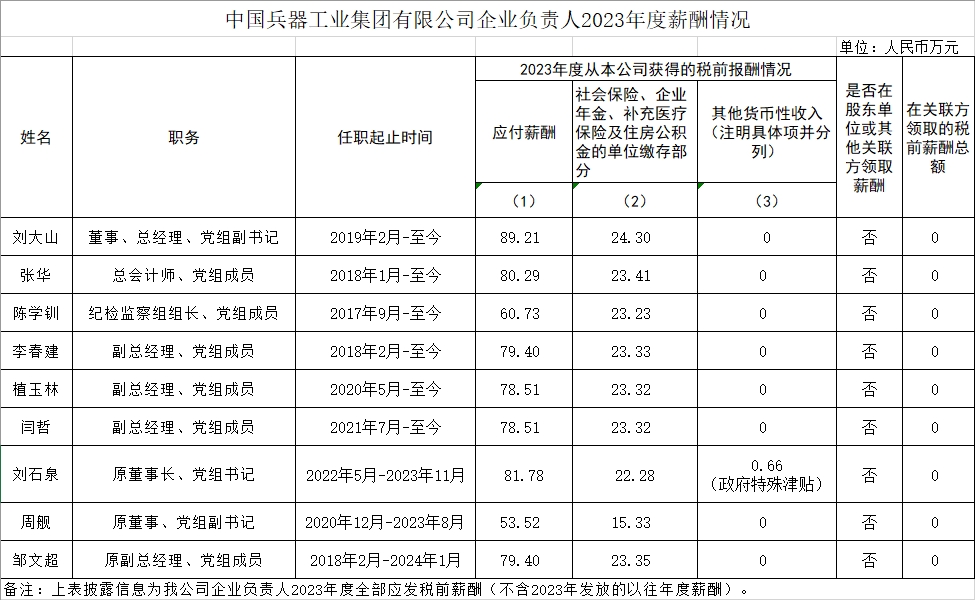 中國兵器工業(yè)集團有限公司企業(yè)負責人2023年度薪酬情況