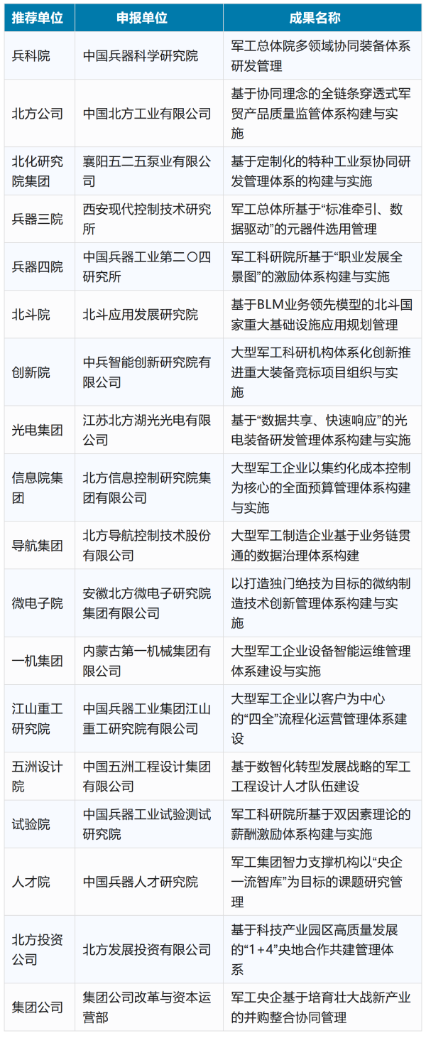 為促進(jìn)管理創(chuàng)新和改革發(fā)展,引導(dǎo)各單位在管理實(shí)踐中運(yùn)用現(xiàn)代管理科學(xué)理論和方法,創(chuàng)新經(jīng)營(yíng)理念,革新管理制度,改進(jìn)管理方式、管理組織、管理方法,營(yíng)造鼓勵(lì)創(chuàng)新、尊重知識(shí)、尊重實(shí)踐、尊重人才的創(chuàng)新環(huán)境。中國兵器工業(yè)集團(tuán)有限公司組織開展了2025年度管理創(chuàng)新成果的申報(bào)、推薦與審定工作。經(jīng)初審、初評(píng)、答辯及終審、公示等環(huán)節(jié),最終評(píng)出獲獎(jiǎng)成果91項(xiàng),其中:一等獎(jiǎng)18項(xiàng)、二等獎(jiǎng)24項(xiàng)、三等獎(jiǎng)49項(xiàng)。 兵器工業(yè)集團(tuán)2025年度一等獲獎(jiǎng)成果名單