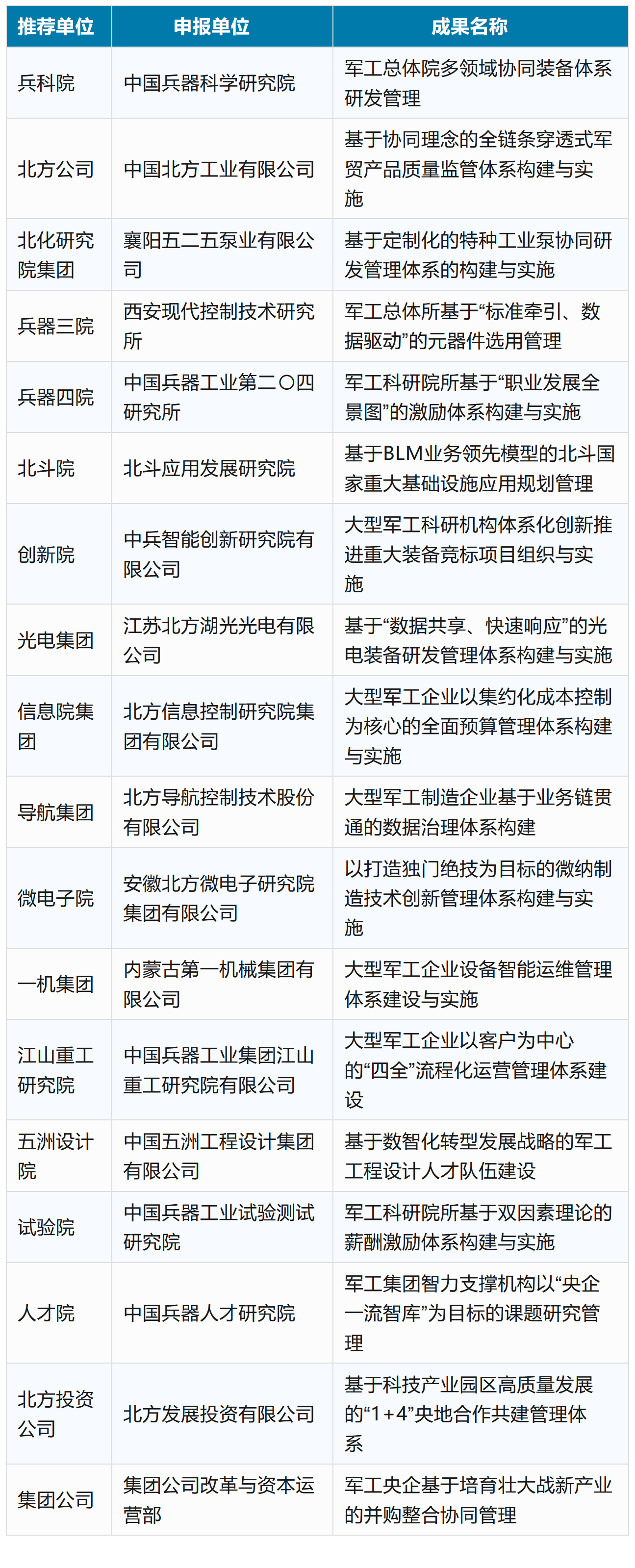 為促進(jìn)管理創(chuàng)新和改革發(fā)展,引導(dǎo)各單位在管理實(shí)踐中運(yùn)用現(xiàn)代管理科學(xué)理論和方法,創(chuàng)新經(jīng)營(yíng)理念,革新管理制度,改進(jìn)管理方式、管理組織、管理方法,營(yíng)造鼓勵(lì)創(chuàng)新、尊重知識(shí)、尊重實(shí)踐、尊重人才的創(chuàng)新環(huán)境。中國兵器工業(yè)集團(tuán)有限公司組織開展了2025年度管理創(chuàng)新成果的申報(bào)、推薦與審定工作。經(jīng)初審、初評(píng)、答辯及終審、公示等環(huán)節(jié),最終評(píng)出獲獎(jiǎng)成果91項(xiàng),其中:一等獎(jiǎng)18項(xiàng)、二等獎(jiǎng)24項(xiàng)、三等獎(jiǎng)49項(xiàng)。 兵器工業(yè)集團(tuán)2025年度一等獲獎(jiǎng)成果名單